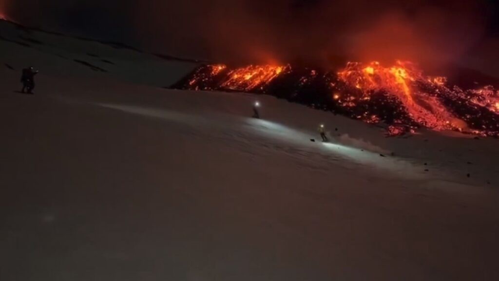 Esquiadores desafían la erupción del monte Etna en un video impactante
