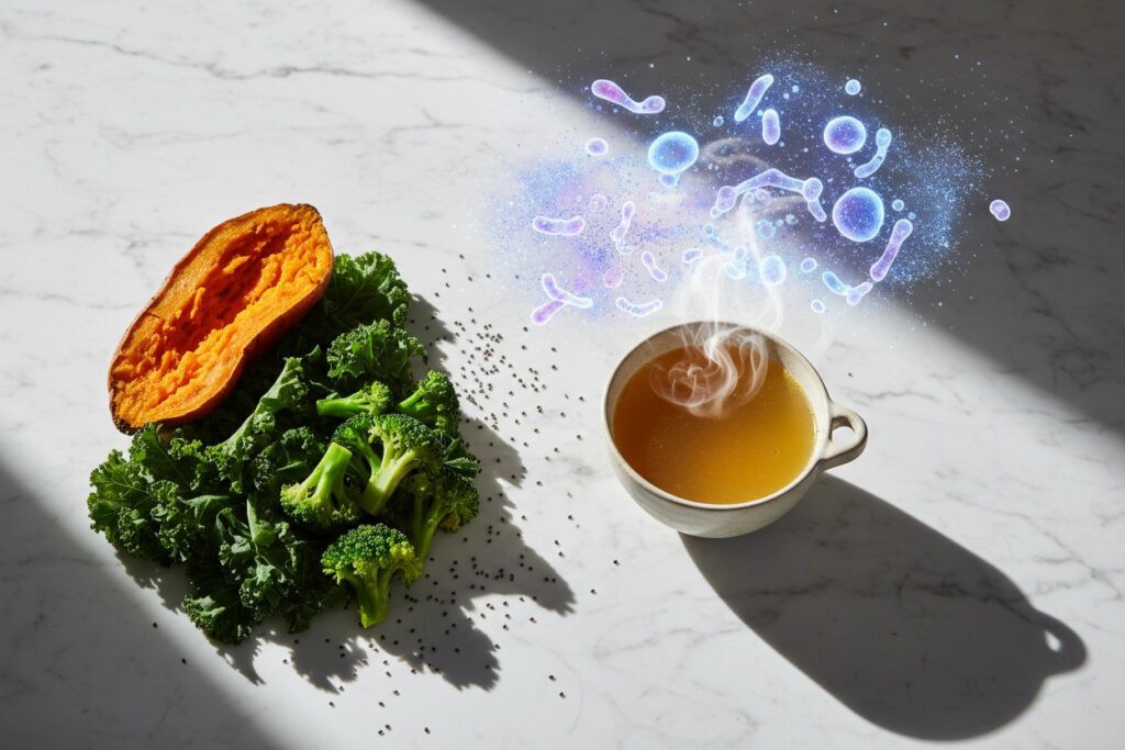 La glicina presente en el caldo de huesos se menciona como un apoyo a los niveles de serotonina y al sueño, ambos aspectos frecuentemente alterados durante la menopausia [1]. Estos alimentos están posicionados como una manera efectiva para abordar síntomas comunes asociados con esta etapa vital como fatiga e hinchazón al favorecer directamente el entorno intestinal.
