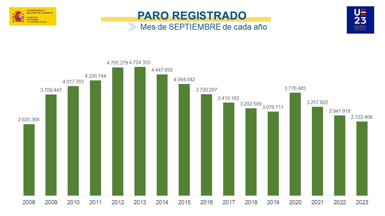 Respecto a septiembre de 2022, el paro interanual ha descendido en 219.451 personas (-7,46%).